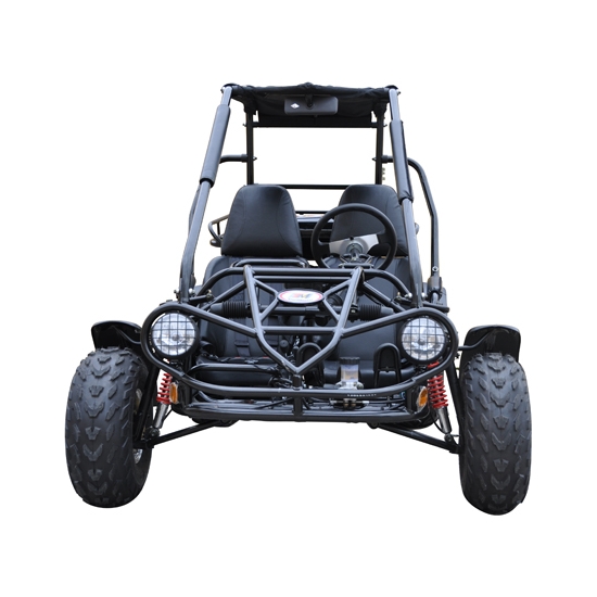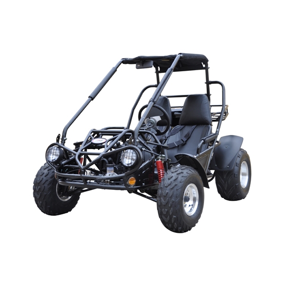 G150-1 150cc gå kart också med rack och pinion styrning, alla hjul skivbromsar, luftkyld motor, aluminiumfälgar, Bikini solskydd, hög/låg-beam strålkastare.